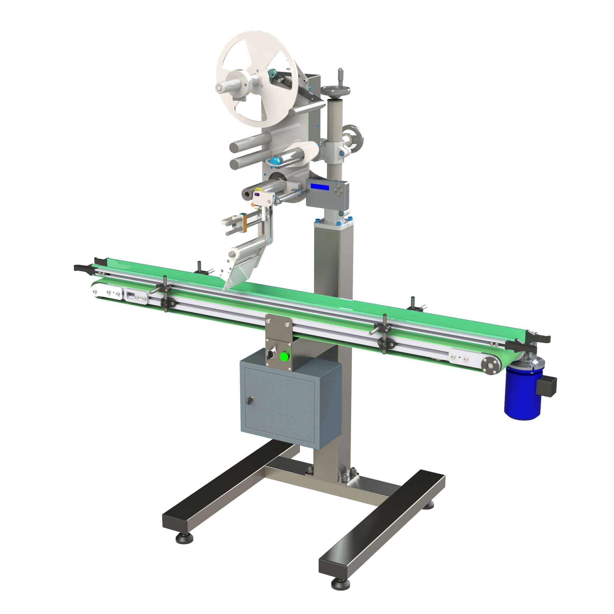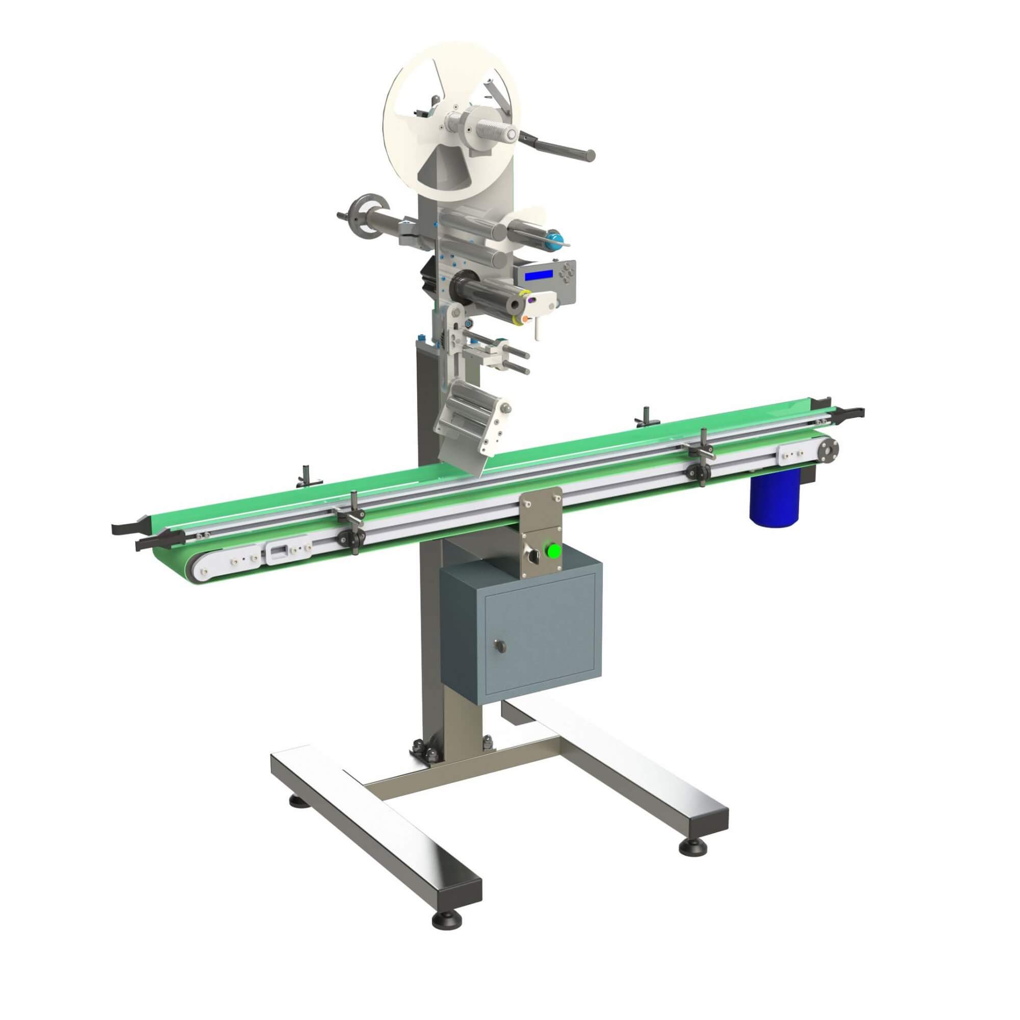 The labeling machine N‑E1‑B is designed for applying labels to the top side of products moving along a conveyor. The machine consists of an automatic label applicator, a base stand, an adjustable stand and a conveyor with guides.